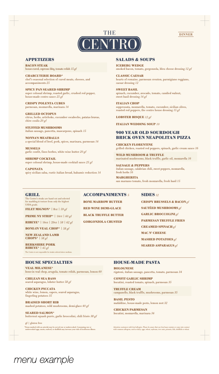 The Centro was a rebrand of the existing freestanding restaurant at The Metropolitan at The 9. Formerly known as “Adega,” The Centro branding provided a fresh take on classic Americana/European cuisine and design. This project was faciliated by the owners and art directed by me and the marketing team at The 9.